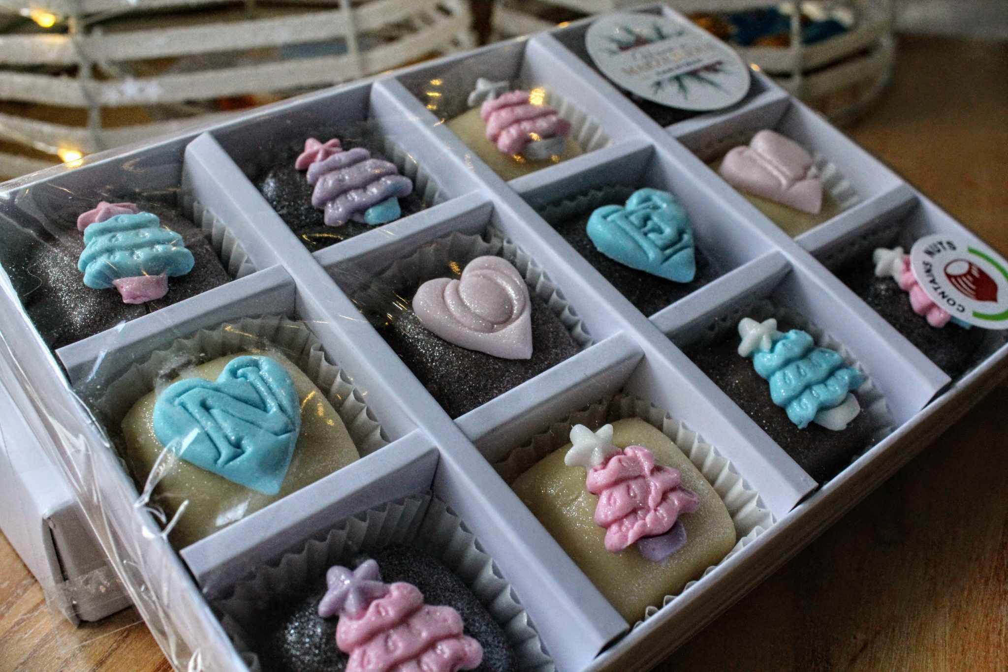 Who wouldn’t love to receive a gift box of these this Christmas. 12 Beautiful handmade pieces of marzipan dipped in the finest chocolate. Each one is handmade and decorated with a little motif of a Christmas Tree’s and NOEL. They come elegantly boxed and can be sent anywhere in the UK. If you would like us to add a message with your gift box just let us know in the notes section at check out.